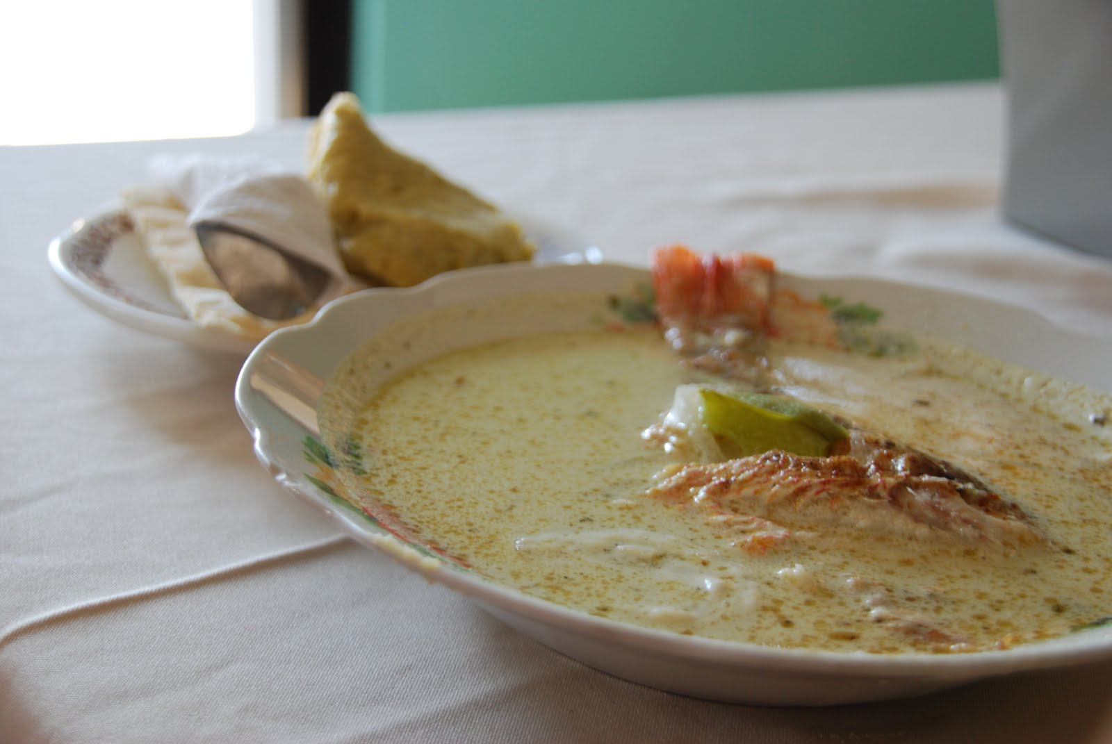 Eating the traditional dish hudut (paste made of plantain) and fish soup